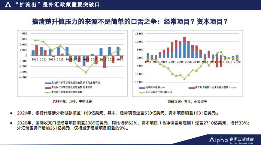 比方说去年,如果从外汇局公布的银行代客跨境收付的数据来看,确确实实顺差1169亿美元,但是经常账户是逆差539亿,资本账户顺差1631亿。如果从口径来看,显然去年人民币升值的压力应该是来自于资本项目,或者说是来自于热钱流入