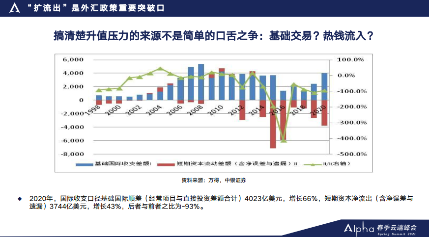 还有一个口径,大家一般讲到资本项目有直接投资,有长期资本,也有短期资本,从长短期资本的这个性质影响来看,从国际收支口径来看,去年我们的基础国际收支顺差,包括了经常项目也包括了直接投资,这两个差额合计是4000亿美元,同比增长了66%。而短期资本净流出是3744亿美元,增长了43%。所以从这个口径我们也可以看到,去年人民币的升值压力主要来自于我们基础交易的顺差太大,而短期资本或者说热钱,并不像大家想象的那样是流入的,反而是流出的